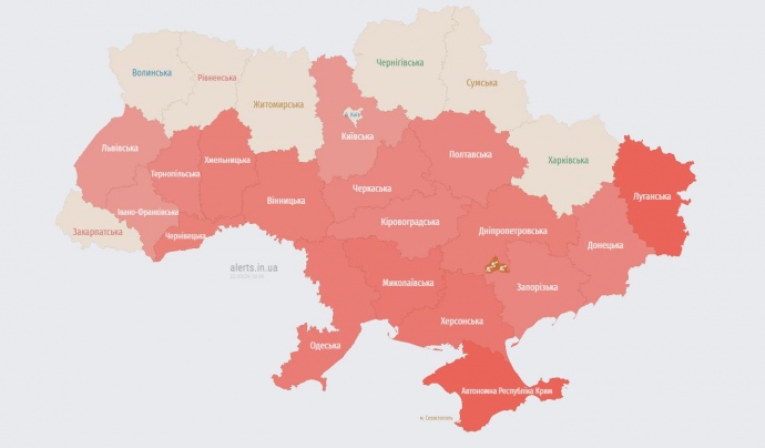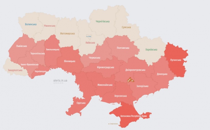 Станом на 02.35 у більшості облстей України оголошена повітряна тривога.