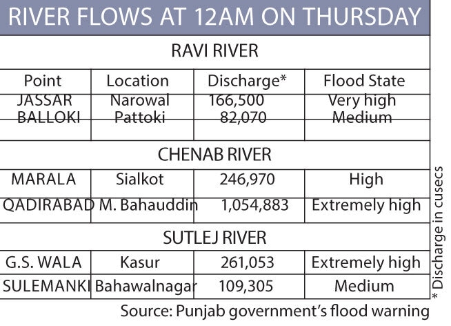 • Over 600,000 affected as floodwaters sweep central parts of province • 15 die in Gujranwala divison • More than 150,000 people, 35,000 heads of livestock shifted to safety • Hundreds of villages affected across Chenab, Ravi and Sutlej belts • Kartarpur Sahib complex submerged, 150 pilgrims rescued • 263 relief, 161 medical camps set up • Officials fear river surge may hit S. Punjab next LAHORE: Large swathes of Punjab are submerged as catastrophic flooding in the Sutlej, Ravi and Chenab rivers forced hundreds of thousands from their homes, causing significant damage to infrastructure and devastates millions of acres of agricultural land. The three trans-boundary rivers have swollen to exceptionally high levels due to a combination of heavy rains and the excess water India is releasing from dams, which then flows across the border. The crisis, which affects central districts, now threatens south Punjab as the combined thrust of four rivers is set to converge on Thursday. The flooding has prompted the govern...