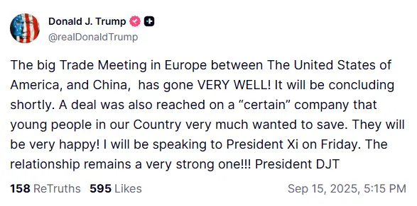 The United States and China have reached a framework agreement to switch short-video app TikTok to US-controlled ownership, top US officials said on Monday, with President Donald Trump set to speak with Chinese President Xi Jinping on Friday. US Treasury Secretary Scott Bessent and US Trade Representative Jamieson Greer announced the agreement after a meeting between senior US and Chinese officials in Madrid, but declined to give any of the commercial terms of the agreement. Bessent told reporters that further details would wait to be determined in a call on Friday between Trump and Xi. Trump said on Monday that trade talks with China had gone very well and hinted that a deal had been reached to resolve issues the US has over TikTok ownership. “The big trade meeting in Europe between the United States of America, and China, has gone very well! It will be concluding shortly,” Trump wrote on his Truth Social platform. “A deal was also reached on a certain company that young people in our Country very much wante...