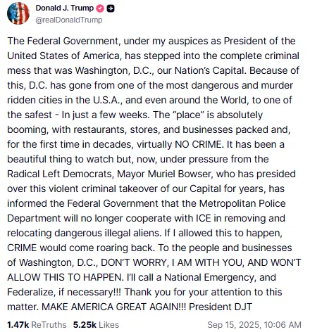United States President Donald Trump said on Monday he would call a national emergency and federalise Washington DC after Mayor Muriel Bowser said its police would not cooperate with Immigration and Customs Enforcement (ICE). At issue is the provision of information on individuals living in, or entering, the United States illegally. Trump’s threat adds to a move critics have seen as federal overreach, with more than 2,000 troops patrolling the city. The comments come after several thousand protesters hit the streets this month over Trump’s August deployment of National Guard troops to “re-establish law, order, and public safety“, after calling crime a blight on the capital. “In just a few weeks. The ‘place’ is absolutely booming … for the first time in decades, virtually no crime,” Trump said on Truth Social. Bowser’s office did not immediately respond to a request for comment on Trump’s post. Earlier, he had put the metropolitan police department under direct federal control and sent federal law enforcement,...